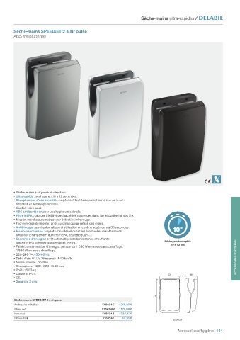 • Débit d’air : 61 l/s. Vitesse air : 540 km/h. ACCESSOIRES D’HYGIÈNE