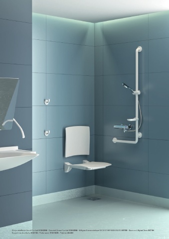 Siège rabattable Grand Confort 510420N - Dosseret Grand Confort 510429N - Mitigeur thermostatique SECURITHERM BIOSAFE H9769 - Barre en L NylonClean 5071N Support de douchette 510110 - Porte-savon 510120N - Patères 4043N