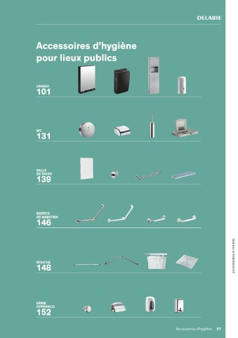 Accessoires d'hygiène pour lieux publics LAVABO 101 WC 131 SALLE DE BAINS 139 BARRES DE MAINTIEN 146 ACCESSOIRES D’HYGIÈNE DOUCHE 148 SÉRIE HYPERECO 152 Accessoires d'hygiène 97