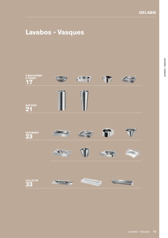 Lavabos - Vasques LAVABOS - VASQUES À ENCASTRER À POSER 17 SUR PIED 21 SUSPENDU 23 COLLECTIF 33 Lavabos - Vasques 15