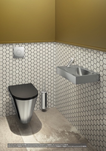 Lave-mains WC LAVANDO 121360 - Robinet automatique TEMPOMATIC 5 449006 - WC suspendu S21 S 110310 Abattant slim noir 102819 - Système de chasse d’eau temporisé encastrable TEMPOFLUX 3 763BOX + 763041 - Porte-balai avec brosse WC 4051S