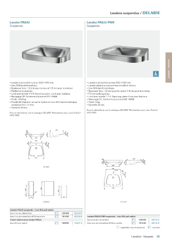 Avec trou de robinetterie Ø 35 au centre 121430 402,38 € Lavabo FRAJU PMR suspendu - Inox 304 poli satiné
