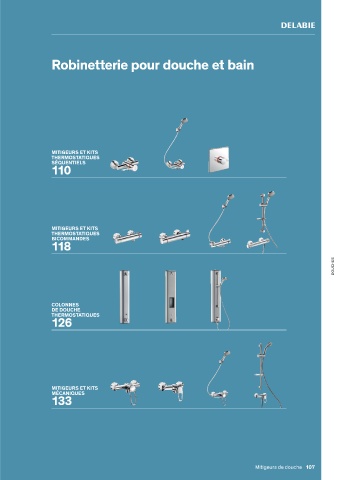 Robinetterie pour douche et bain MITIGEURS ET KITS THERMOSTATIQUES SÉQUENTIELS 110 MITIGEURS ET KITS THERMOSTATIQUES BICOMMANDES 118 DOUCHES COLONNES DE DOUCHE THERMOSTATIQUES 126 MITIGEURS ET KITS MÉCANIQUES 133 Mitigeurs de douche 107