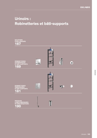 Urinoirs : Robinetteries et bâti-supports SOLUTIONS POUR URINOIRS 167 ROBINETTERIES AUTOMATIQUES ET BÂTI SUPPORTS 169 URINOIRS ROBINETTERIES TEMPORISÉES ET BÂTI SUPPORTS 181 PRODUITS COMPLÉMENTAIRES ET PRÉCONISATIONS 190 Urinoirs 165