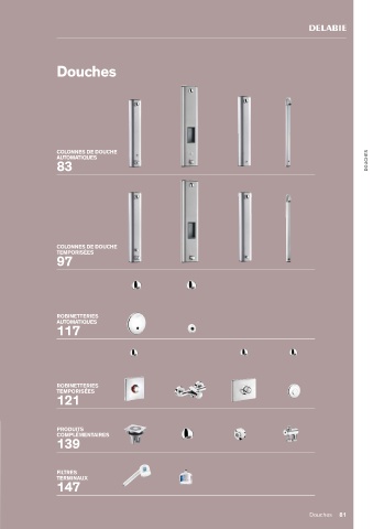 Douches COLONNES DE DOUCHE AUTOMATIQUES DOUCHES 83 COLONNES DE DOUCHE TEMPORISÉES 97 ROBINETTERIES AUTOMATIQUES 117 ROBINETTERIES TEMPORISÉES 121 PRODUITS COMPLÉMENTAIRES 139 FILTRES TERMINAUX 147 Douches 81