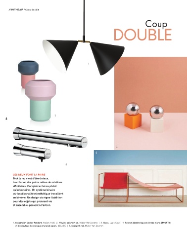 1. Suspension Double Pendant, Atelier Areti | 2. Moulins poivre et sel, Muller Van Severen | 3. Vases, Lucie Kass | 4. Robinet électronique de lavabo mural BINOPTIC