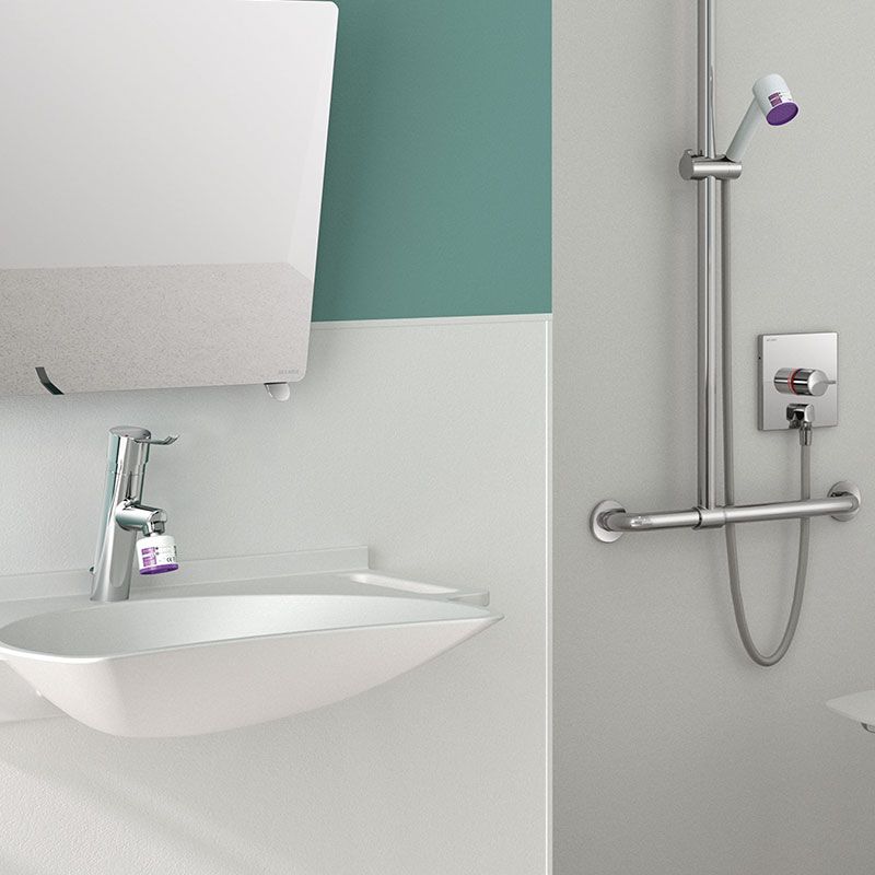 Nauwkeurig beheer van herbesmetting: beschermkraag en optimale plaatsing van de filter dankzij de schuine aansluiting (hiermee kan de positie van de filter worden aangepast zodat de waterstraal niet op de afvoerplug valt).