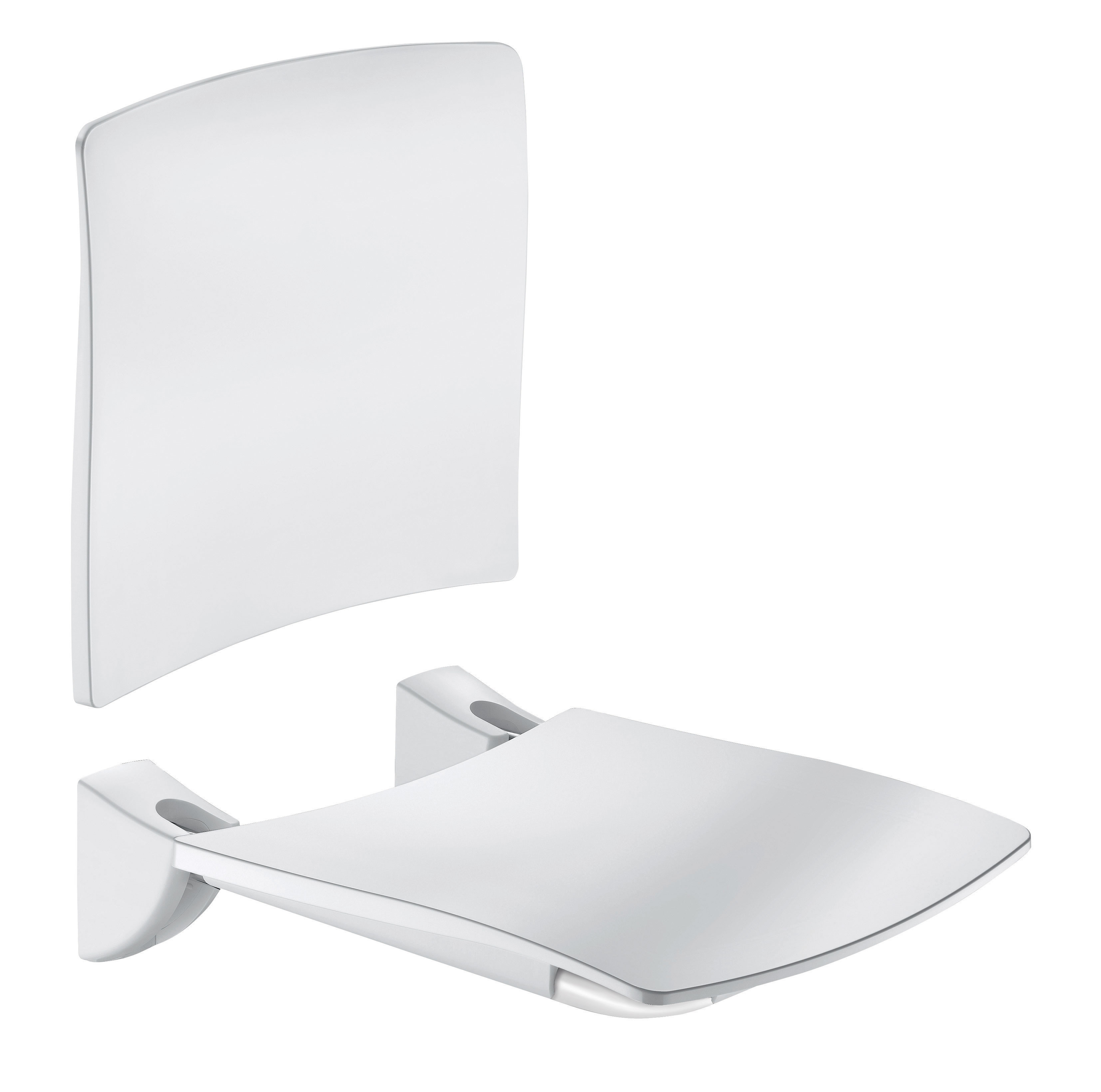 Siège de douche rabattable et dosseret pour siège de douche garantis 30 ans. Marqués CE.
