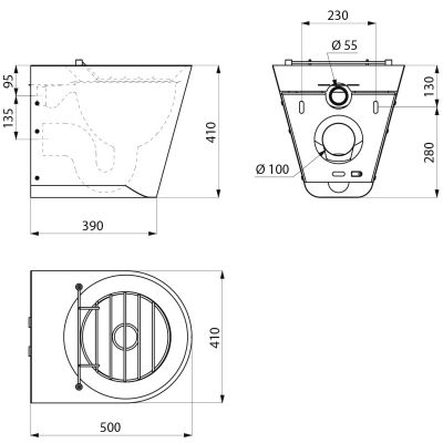 Évacuation d’eau horizontale, encastrée Ø 100 mm.