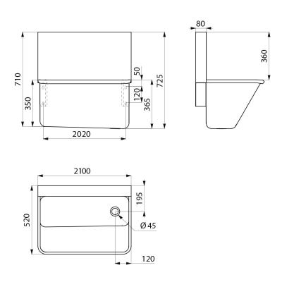 L. 2100 mm, 3 postes. Sans trou de robinetterie.