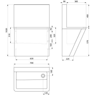 L. 700 mm, 1 poste. Sans trou de robinetterie.