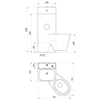 Le WC est entièrement soudé au lavabo, pas de vis : facilite le nettoyage et empêche la dissimulation d’objets.
