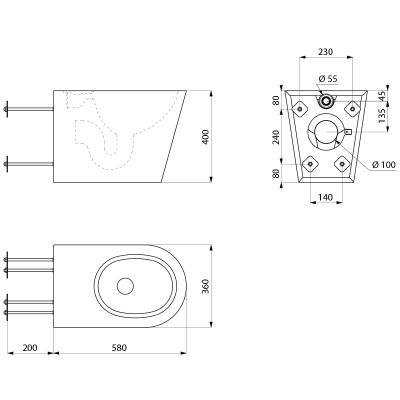 WC à poser au sol pour montage en traversée de cloison pour gaine technique.