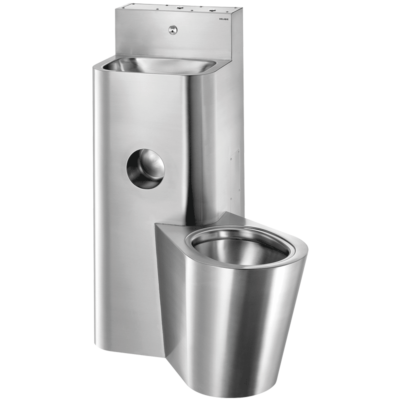 Le WC est entièrement soudé au lavabo, pas de vis : facilite le nettoyage et empêche la dissimulation d’objets.