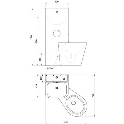 Réf. 160600Combi lavabo avec WC à droite posé au sol et porte-papier WC encastré.