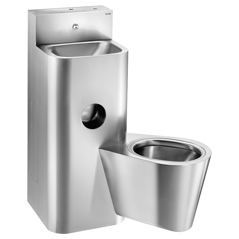 Le WC est entièrement soudé au lavabo, pas de vis : facilite le nettoyage et empêche la dissimulation d’objets.