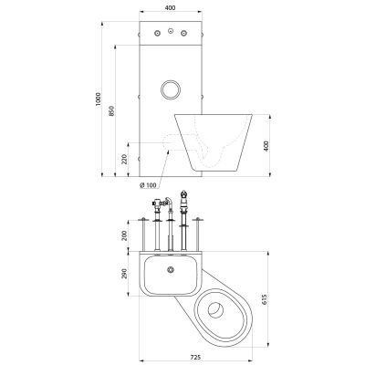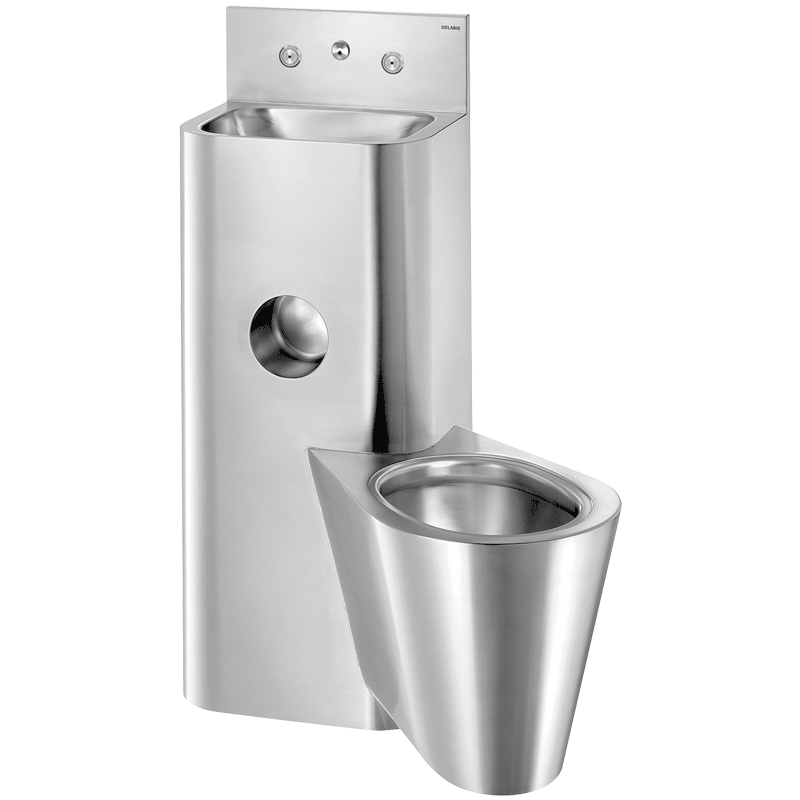Le WC est entièrement soudé au lavabo, pas de vis : facilite le nettoyage et empêche la dissimulation d’objets.