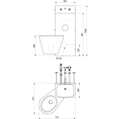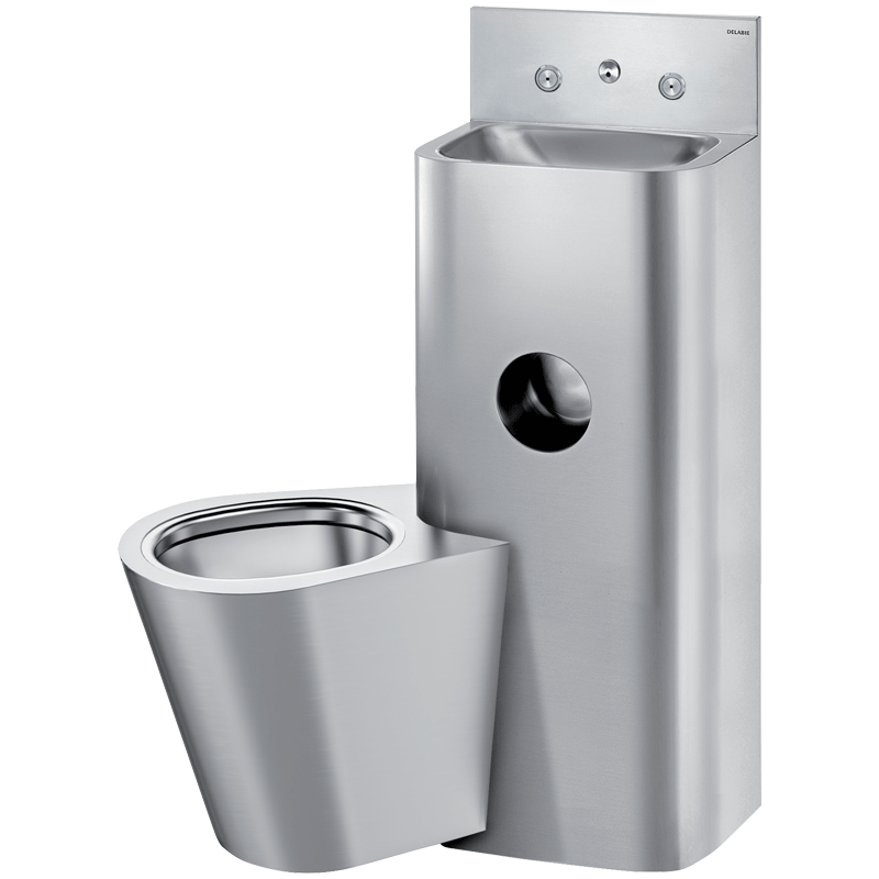 Le WC est entièrement soudé au lavabo, pas de vis : facilite le nettoyage et empêche la dissimulation d’objets.