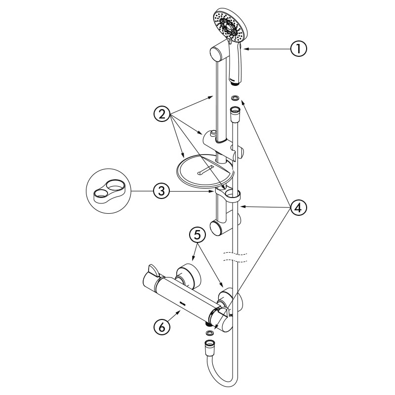 • Pommeau de douche coulissant (réf. 813) sur rampe chromée (réf. 821) avec porte-savon et flexible (réf. 836T1).
