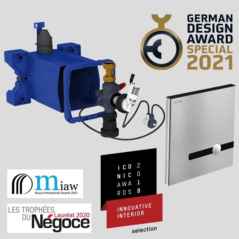 Robinet d’arrêt et de réglage de débit, module de déclenchement et électronique intégrés et accessibles par l’avant.