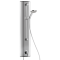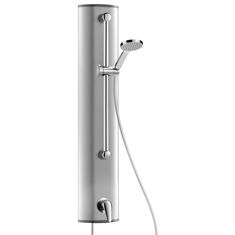 Pommeau de douche coulissant sur rampe chromée avec flexible.