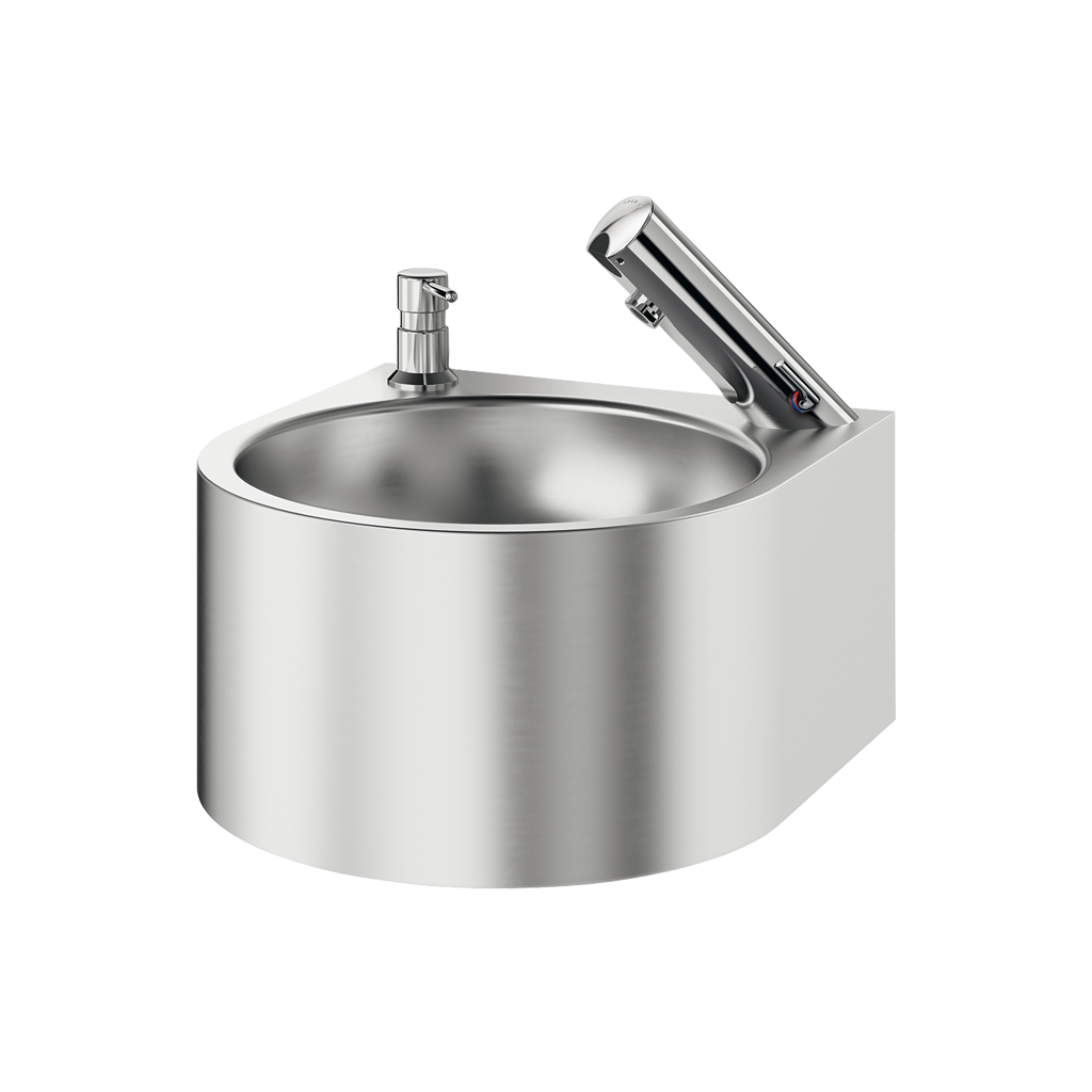 Livré avec un mitigeur automatique à piles et électrovanne intégrées et un distributeur de savon ou gel hydroalcoolique en laiton chromé.